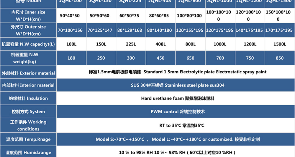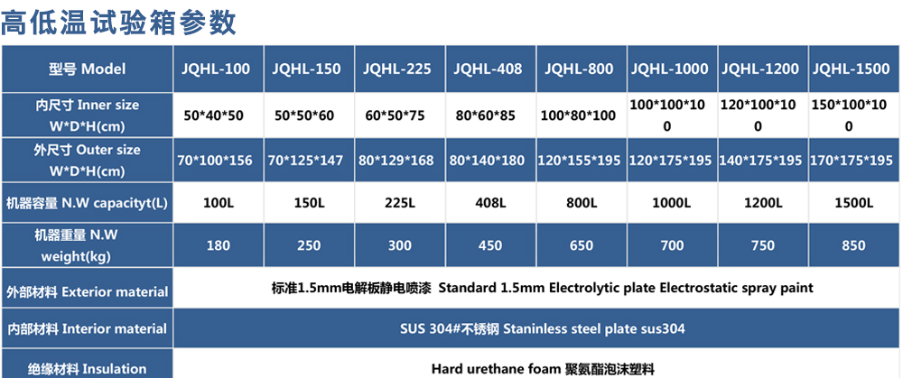 用途:高低溫試驗箱 JQHL-100L-1000L為電子、電工、儀表、零部件、材料等試驗樣品進行高溫、低溫、或者恒定試驗的溫度環(huán)境變化后的參數(shù)及性能測試。適用于汽車、航空、高校,專業(yè)實驗室研究開發(fā)