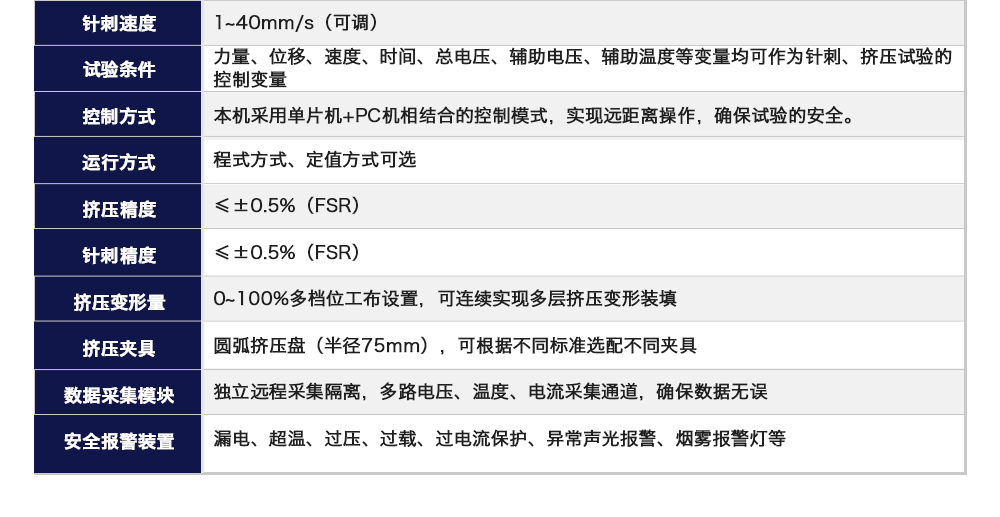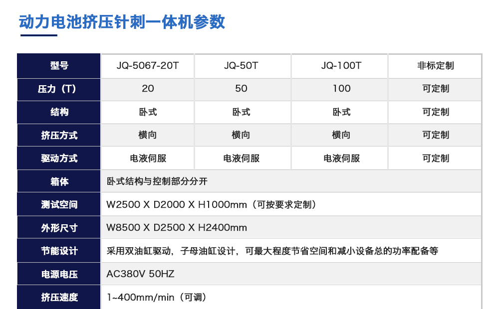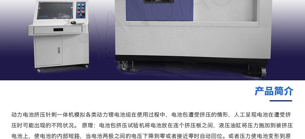 用途:動力電池擠壓針刺一體機模擬各類動力鋰電池組在使用過程中,電池包遭受擠壓的情形,人工呈現(xiàn)電池在遭受擠壓時可能出現(xiàn)的不同狀況。 原理:電池包擠壓試驗機將電池放在連個擠壓