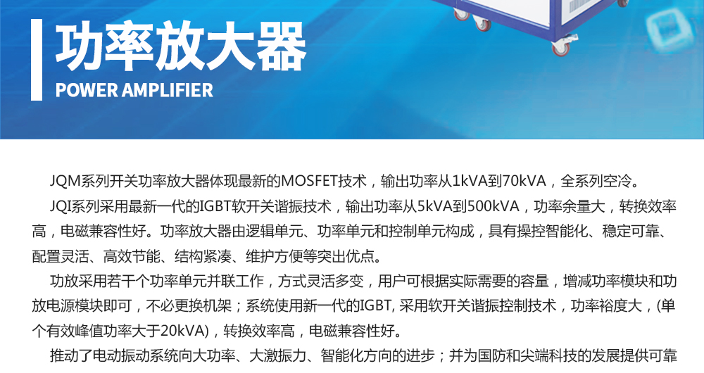 用途:功率放大器由邏輯單元、功率單元和控制單元構成,具有操控智能化、穩定可靠、配置靈活、高效節能、結構緊湊、維護方便等突出優點。